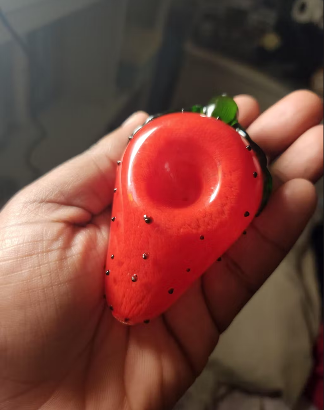 This delightful strawberry-shaped piece is perfectly sized to fit comfortably in your hand. Featuring intricate green leaves and black spotted seeds, it adds a touch of fun and style. Crafted from durable borosilicate glass, it’s built to last while being easy to maintain. - Dimensions: 3" long